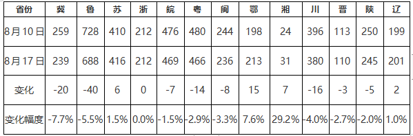截至8月17日,重點(diǎn)監(jiān)測(cè)省份生產(chǎn)企業(yè)庫(kù)存總量為3906萬(wàn)重量箱,較上周四庫(kù)存下降83萬(wàn)重量箱,降幅2.08%,庫(kù)存環(huán)比降幅縮小7.71個(gè)百分點(diǎn),庫(kù)存天數(shù)約19.11天,較上周減少0.40天(注:本期庫(kù)存天數(shù)以截至本周四樣本企業(yè)在產(chǎn)日熔量核算)。本周重點(diǎn)監(jiān)測(cè)省份產(chǎn)量1311.00萬(wàn)重量箱,消費(fèi)量1394.00萬(wàn)重量箱,產(chǎn)銷率106.33%。